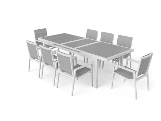 Genießen Sie Ihre Mahlzeiten unter freiem Himmel, und das gleich mit mehreren Personen. Das edle Esstisch Set Santorini XL aus der Ilios Collection beinhaltet einen Auszugstisch mit grauer Glasplatte (matt) sowie acht Stapelstühle mit Armlehnen, welche über zwei Lagen Textilene mit Schnelltrockenschaum verfügen. Das moderne Material bietet viele Vorteile: Es ist reißfest, atmungsaktiv, elastisch und zudem witterungsbeständig – die perfekte Möblierung für den Außenbereich. Verschmutzungen können Sie mit einem feuchten Tuch leicht entfernen.