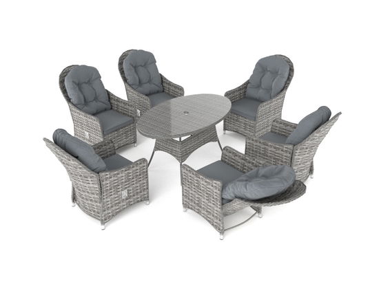 Ein runder Tisch, eine schicke Kombination von sechs Stühlen mit verstellbaren Rückenlehnen, die eher als Sessel bezeichnet werden: So lässt es sich bestens miteinander reden, während Sie Kuchen essen oder Fingerfood genießen.