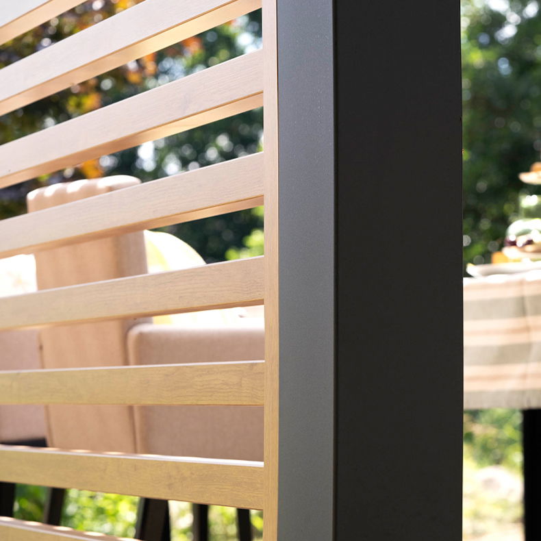 Lamellenwände aus Aluminium oder in Holzoptik bieten einen eleganten, robusten Sichtschutz für Ihre PERGOLIA. Flexibel einsetzbar und nachträglich montierbar - für eine Gestaltung, die sich Ihren Bedürfnissen anpasst.