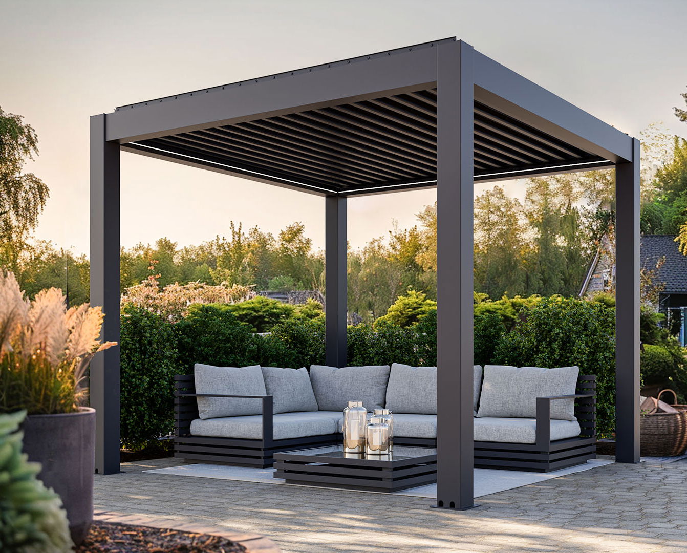 Mit PERGOLIA genießen Sie Ihren Außenbereich bei Sonne, Wind und Regen – dank verstellbarem Lamellendach komfortabel und stilvoll.