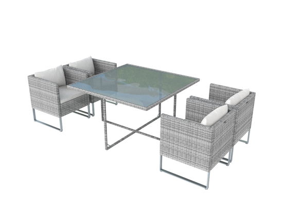 Das edle Cube Set verfügt über einen Rahmen aus robustem Aluminium, das Rattangeflecht ist farblich schattiert. Das Besondere an diesem Set ist der geringe Platzbedarf. Werden die Sessel nicht benötigt, lassen sie sich so unter den Tisch schieben, dass die Gruppe wie ein quadratischer Würfel erscheint. Auf diese Weise steht auf der Terrasse mehr Fläche zur Verfügung, die Sie anderweitig nutzen können. Das elegante Modell aus der City Collection kann also gleich mehrfach punkten.