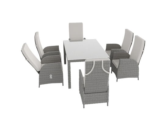 Das elegante Esstisch Set Ceres Relax M aus der Classics Collection bietet Platz für sechs Personen. Es besteht aus einem rechteckigen Tisch mit Klarglasplatte sowie sechs Armlehnstühlen, von denen jeder über eine verstellbare Rückenlehne verfügt. Die Rückenneigung wird mittels Riegel im Seitenbereich des Sessels reguliert. Diese edle Gruppe aus Rattan ist wie geschaffen für eine gemütliche Mahlzeit unter freiem Himmel – ein Ort, der Behaglichkeit schenkt.